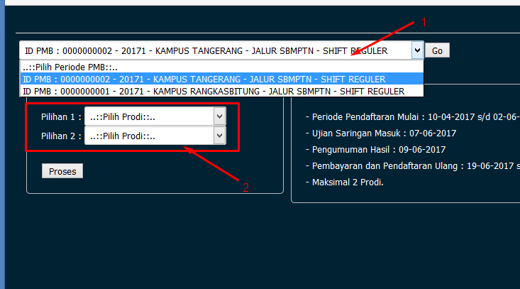 Pilih ID PMB & PILIHAN PRODI yang diinginkan kemudian klik tombol PROSES.